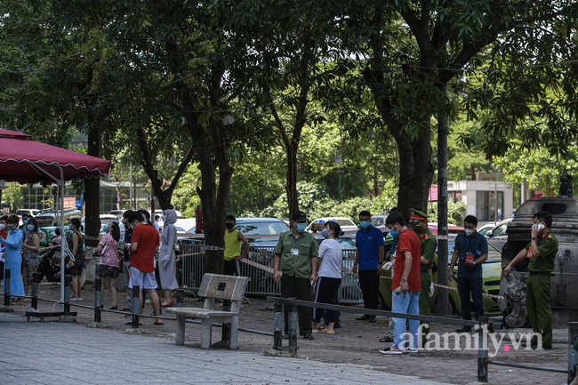 Khoảng 11h ngày 21/8, nhiều người dân xếp hàng tại trước sảnh chung cư HH1B Linh Đàm, phường Hoàng Liệt, quận Hoàng Mai, Hà Nội lấy mẫu xét nghiệm. Thời điểm này có nhiều nhân viên y tế cũng đang làm nhiệm vụ.