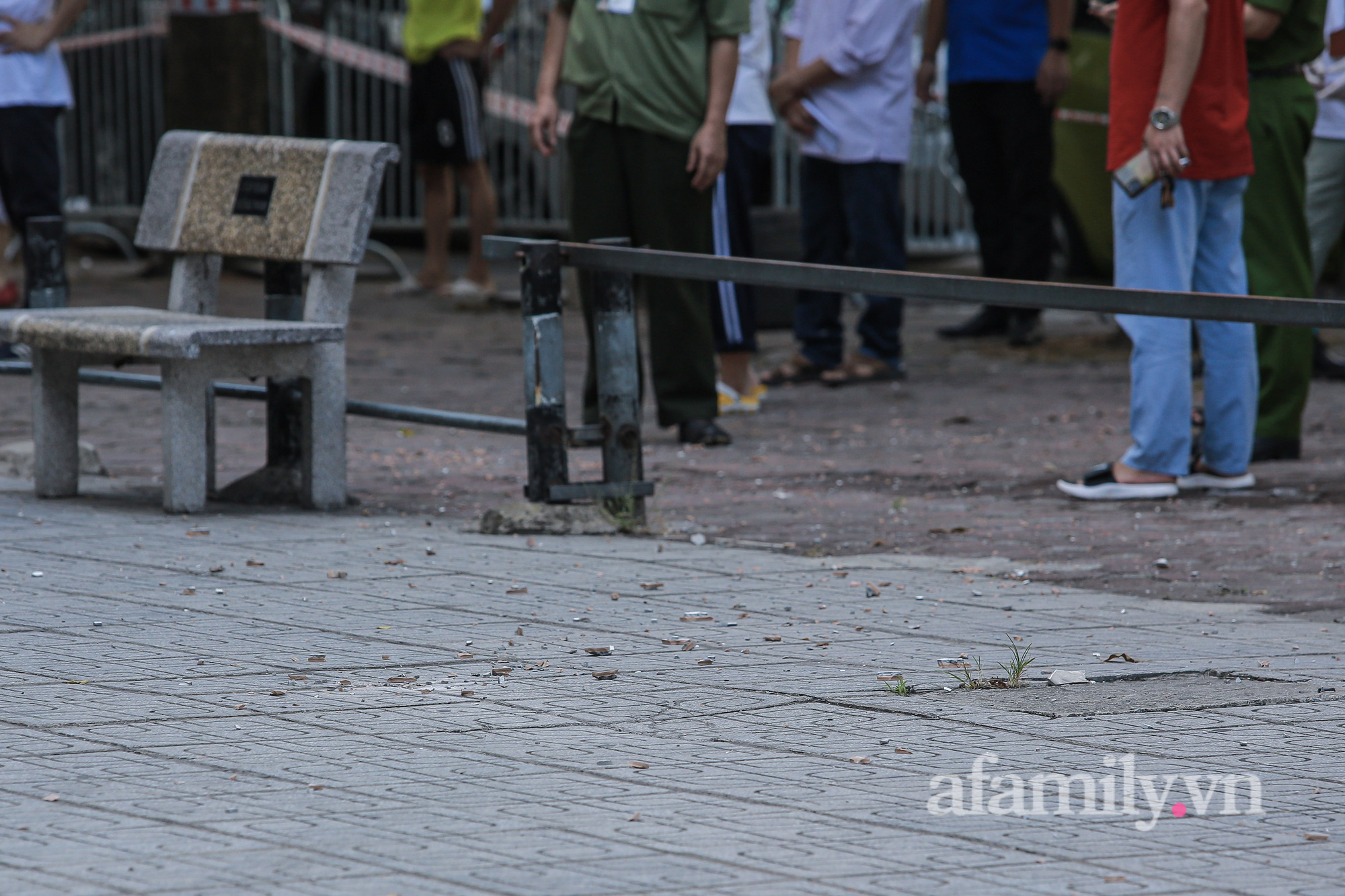 Có mặt trực tiếp tại khu vực xảy ra sự việc, mảng gạch vỡ vụn thành nhiều mảnh nhỏ rơi vãi quanh khu vực sảnh toà nhà. Nhiều người phán đoán mảng gạch men này rơi ở tầng cao mới vỡ vụn như vậy.