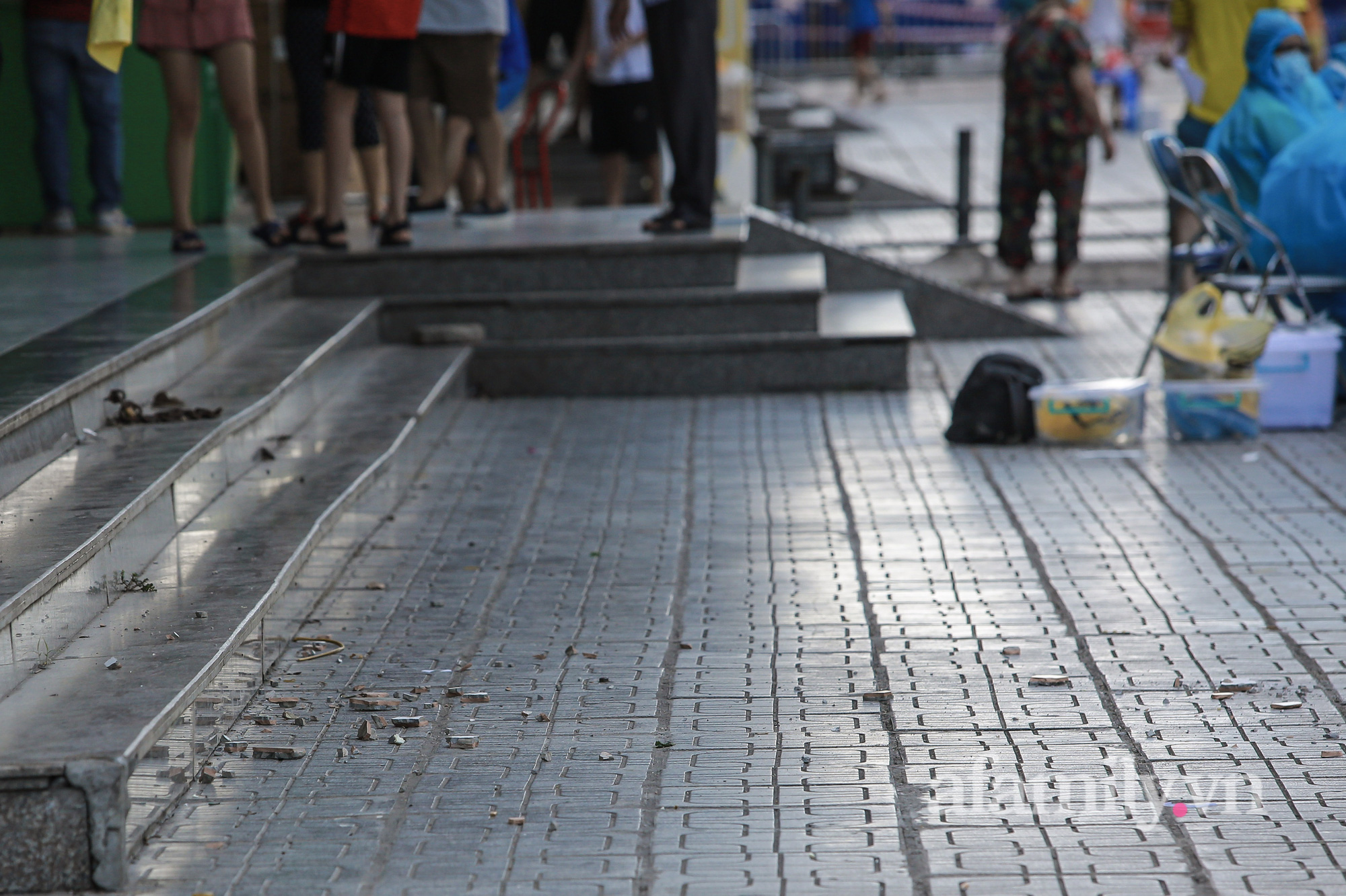 Đúng lúc này một mảng gạch men cỡ lớn bất ngờ từ tầng cao rơi xuống đất vỡ vụn thành nhiều mảnh nhỏ bắn xung quanh. Sự việc diễn ra bất ngờ khiến nhiều người dân không khỏi ngỡ ngàng, thót tim. Một nam thanh niên trong quá trình chờ lấy mẫu xét nghiệm đã bị mảng gạch bắn vào chân gây chảy máu.