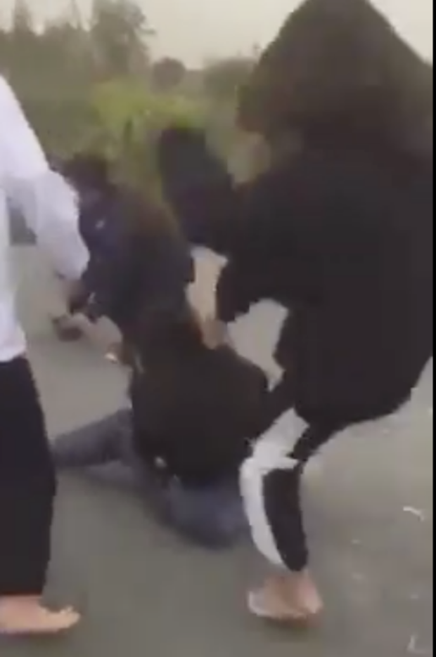 Đoạn clip cho thấy, một cô gái mặc áo đen đứng bên cạnh một nhóm người cả nam lẫn nữ ở khu vực vắng người qua lại. Lúc này, cô gái đã bị một bạn nữ áo trắng túm tóc giật ngã ra đất rồi đạp đá liên tiếp vào vùng đầu, mặt.