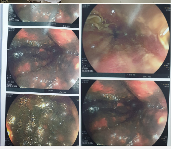 Kết quả nội soi toàn bộ đường tiêu hóa của bệnh nhân cho thấy niêm mạc thực quản bị phù nề xung huyết, có loét nông kèm theo giả mạc trắng, long tróc biểu mô thực quản. Dạ dày bệnh nhân có nhiều dịch đen bẩn. Toàn bộ niêm mạc dạ dày viêm loét phù nề xung huyết mạnh. Niêm mạc hành tá tràng và tá tràng cũng viêm loét phù nề, xung huyết mạnh. Hiện bệnh nhân đang được theo dõi sát sao, duy trì dinh dưỡng, kháng sinh…
