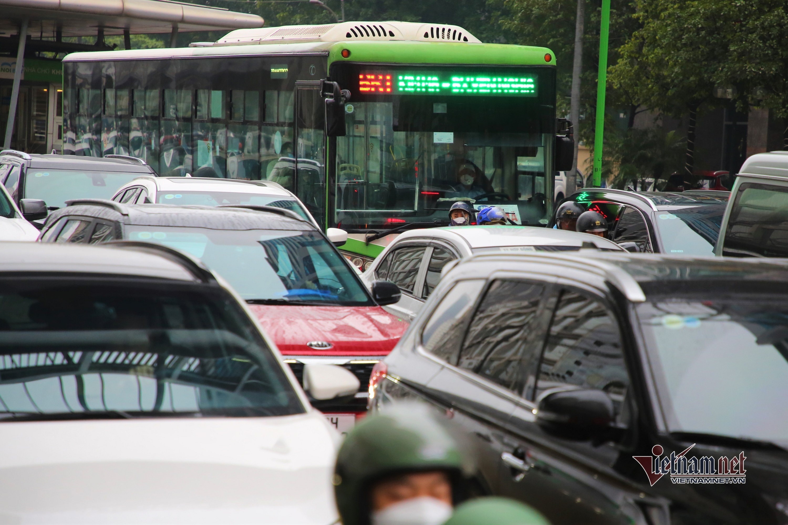 Vì ô tô chiếm hết lòng đường, xe máy tràn vào làn dành riêng cho xe buýt nhanh (BRT) để lưu thông. Xe buýt nhanh liên tục bị các phương tiện khác lấn làn, tạt đầu…