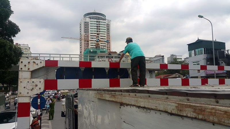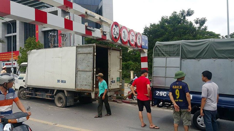 Hậu quả, phần thùng xe chạm vào thanh chắn ngang của khung sắt nói trên và mắc kẹt tại đó.