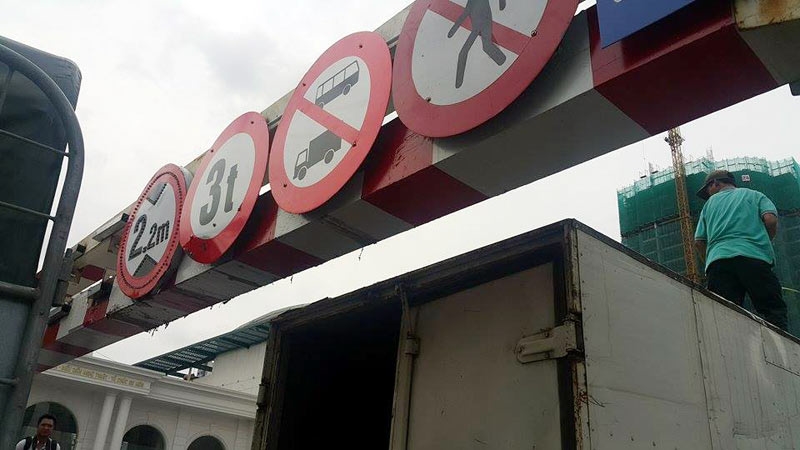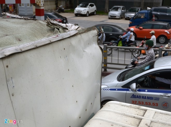Thùng xe phía trước bị móp do đâm vào thanh chắn ngang hạn chế chiều cao. Ảnh Zing.vn |