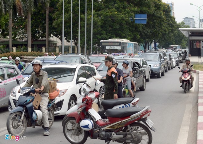 Giao thông trước Công viên Thành Công ùn ứ nghiêm trọng do hướng lưu thông trên cầu bị ngăn, các phương tiện được phân làn đi ở phần đường dưới cầu vượt. Ảnh Zing.vn |