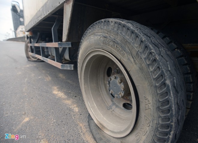 Tài xế xịt hết lốp 6 bánh xe nhưng vẫn không thoát ra được. Ảnh Zing.vn |