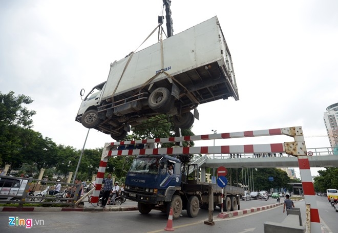 Đến 13h25, lực lượng chức năng đã dùng xe cẩu chuyên dụng để nâng chiếc xe ra khỏi cầu tránh làm hư hỏng thanh chắn ngang hạn chế chiều cao cũng như trả lại làn đường cho các phương tiện lưu thông. Ảnh Zing.vn |