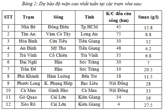 Dự báo độ mặn cao nhất tuần từ 2 -8/4 |
