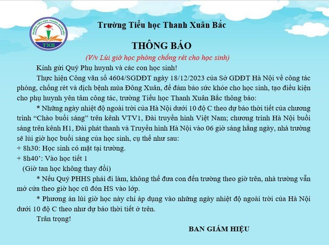 Trong khi đó, Ban giám hiệu Trường Tiểu học Thanh Xuân Bắc đã đưa ra quyết định lùi giờ học phòng chống rét cho học sinh. Trường cho biết việc này nhằm đảm bảo sức khỏe cho học sinh, do thời tiết từ khoảng giữa tháng 12 tới tháng 1 hàng năm rất lạnh.