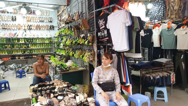Vừa kéo nhẹ khẩu trang xuống dưới cằm, ông Hưng (46 tuổi), chủ quầy hàng thời trang trẻ em tại chợ Nhà Xanh đon đả giới thiệu hàng hóa.