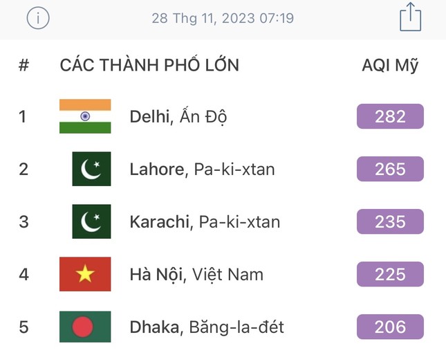Air Visual, ứng dụng theo dõi chất lượng không khí trên toàn thế giới ghi nhận chỉ số chất lượng không khí (AQI) của Hà Nội lúc 7 giờ sáng nay là 225 - ngưỡng rất xấu (rất có hại cho sức khỏe tất cả mọi người), xếp thứ 4 trong danh sách gần 100 thành phố, chỉ sau Delhi của Ấn Độ, Lahore và Karachi của Pakistan – những thủ phủ ô nhiễm nhất thế giới nhiều năm qua.