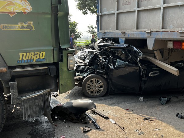 Vụ tai nạn khiến 3 người trên ô tô con thương vong. Tại hiện trường, ô tô con bẹp rúm, bị ép nằm dưới gầm ô tô tải. Hai xe tải bị hư hỏng.