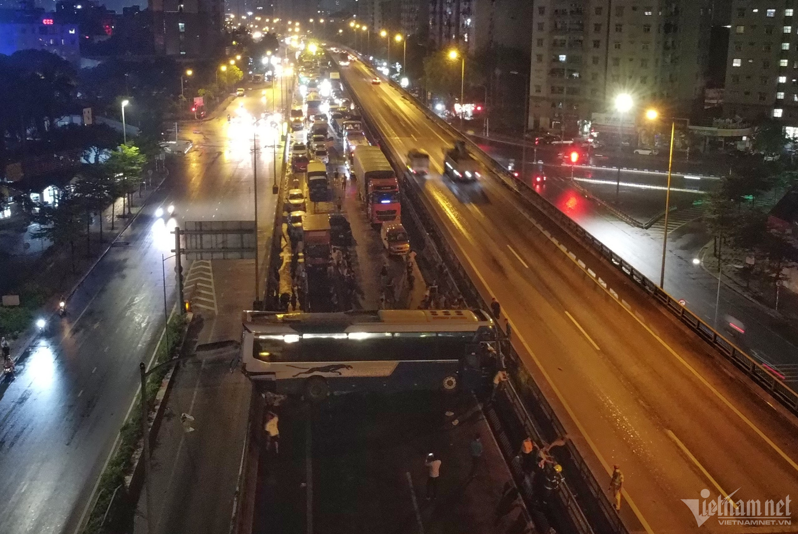 Cụ thể, khoảng 22h30, ô tô khách loại 45 chỗ (chưa rõ biển kiểm soát) đang lưu thông trên đường Vành đai 3 trên cao (hướng quận Thanh Xuân đi quận Hoàng Mai) thì bất ngờ nổ lốp khiến xe bị văng, chắn ngang đường.