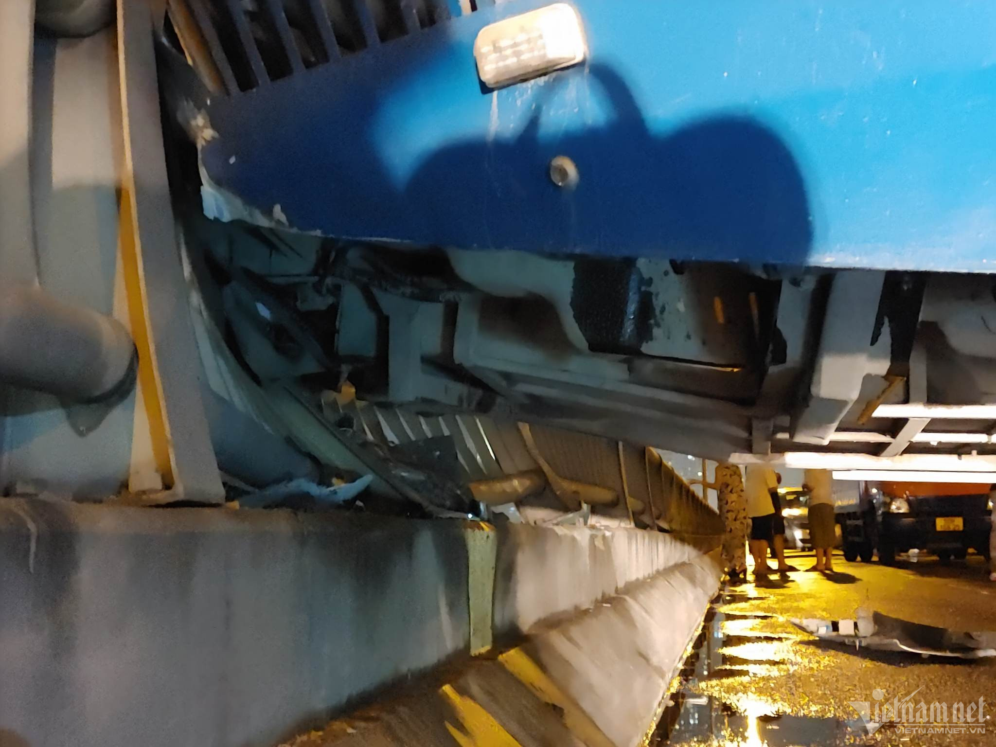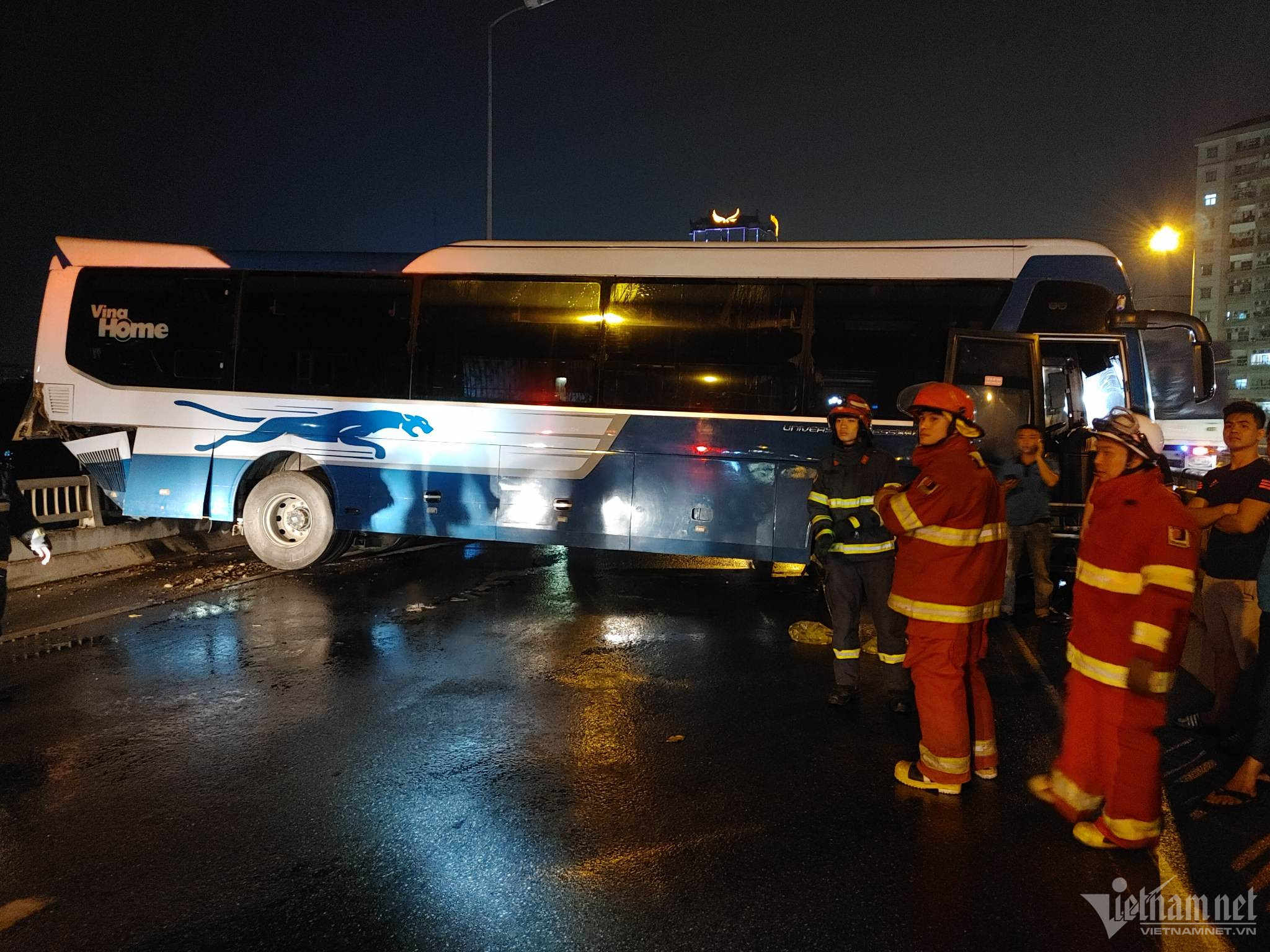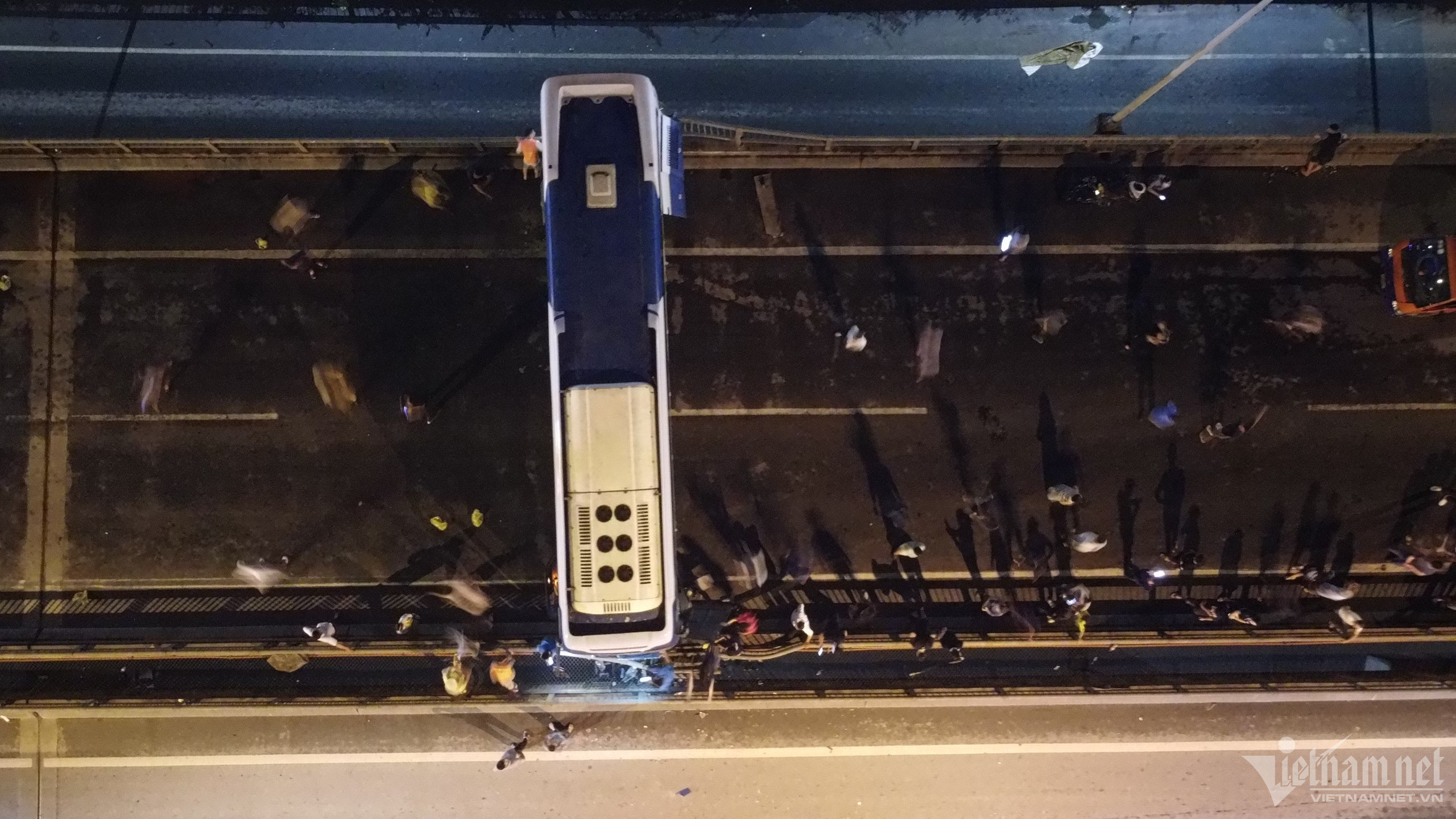 Tại hiện trường, phần đầu và đuôi xe mắc kẹt vào lan can hai bên đường. Ô tô bị nghiêng sang một bên. Thời điểm xảy ra sự cố, trên xe có khoảng 30 người nhưng không ai bị thương.