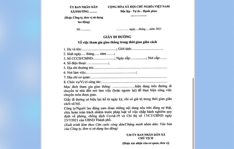 Giấy đi đường sẽ do cơ quan, đơn vị hoặc chính quyền địa phương - nơi người đi đường làm việc hoặc sinh sống ký xác nhận. Trong giấy đi đường có khai báo các thông tin cá nhân (tên, tuổi, giới tính, căn cước công dândân (hoặc chứng minh nhân dân), nơi ở, nơi làm việc) và mục đích đi lại. Giấy đi đường phải sử dụng kèm theo căn cước công dân, chứng minh thư nhân dân; văn bản của đơn vị sử dụng lao động).