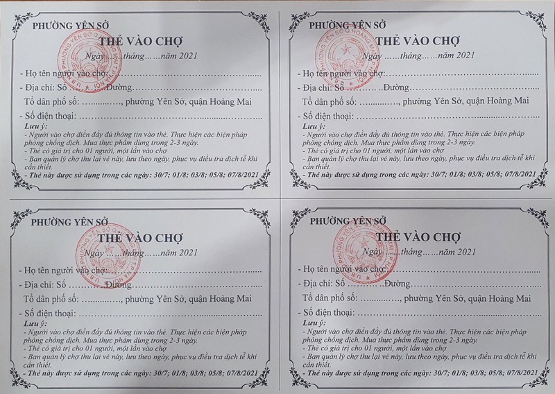 Trong các ngày 28, 29 và 30-7, chính quyền nhiều xã phường tại Hà Nội cũng bắt đầu phát thẻ đi chợ (phiếu đi chợ) cho cư dân. Thẻ vào chợ được sử dụng cho 1 người/1 lần vào chợ. Mỗi hộ dân sẽ được phát một số thẻ quy định ngày đi chợ cụ thể (theo ngày chẵn, hoặc ngày lẻ). Ban quản lý các chợ sẽ thu lại thẻ này sau mỗi lần được người dân sử dụng để điều tra dịch tễ.