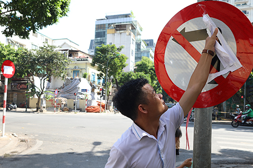 Hai ngày trước, hàng chục biển báo hướng dẫn giao thông tại chỗ và từ xa được cắm thêm để người dân làm quen với cách phân luồng mới. Ở giai đoạn 1, đơn vị thi công rào chắn một phần đường bên dãy nhà số chẵn, dài khoảng 200 m. Diện tích đường (bên số lẻ) để xe cộ qua lại chỉ còn 5 m. Phần vỉa được giữ lại từ 1,2 m đến 3 m cho người đi bộ và xe máy lưu thông 2 chiều.