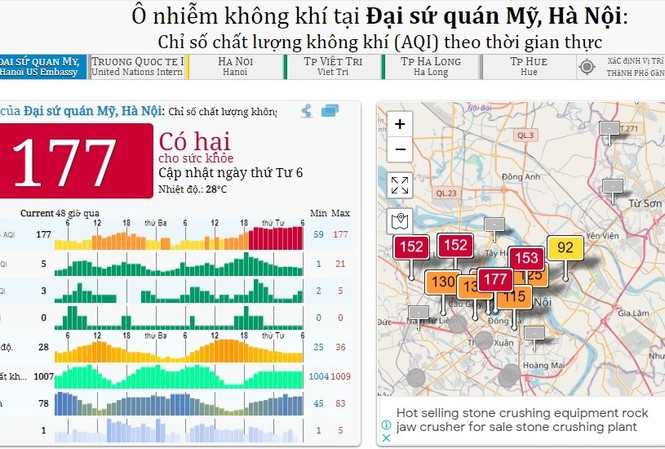 Hệ thống quan trắc của Sở Tài nguyên và Môi trường Hà Nội cũng như hệ thống quan trắc của Đại sứ quán Mỹ cũng ghi nhận chất lượng không khí ở ngưỡng đỏ, có hại cho sức khỏe tất cả mọi người khi ra đường.
