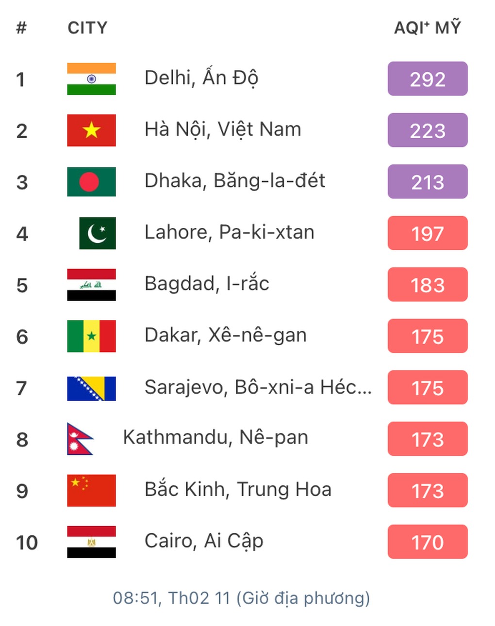 Đến hơn 8h sáng cùng ngày, trang tổng hợp hơn 30.000 trạm quan trắc không khí trên toàn thế giới (IQAir) công bố chỉ số AQI của Hà Nội đạt mức 223 – thuộc ngưỡng "rất xấu", chỉ đứng sau thành phố Dehli (Ấn Độ) về mức độ ô nhiễm toàn cầu.