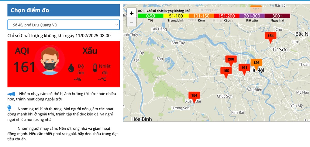 Theo số liệu từ hệ thống quan trắc chất lượng không khí (AQI) của Hà Nội, nhiều khu vực trong thành phố ghi nhận chất lượng không khí ở mức xấu, với chỉ số AQI dao động từ 151 đến 200. Đáng chú ý, vào khoảng 6h-7h sáng, điểm đo tại trước cổng Trường Đại học Bách khoa Hà Nội (đường Giải Phóng, quận Hoàng Mai) cho kết quả ở ngưỡng "rất xấu" (màu tím), chỉ số AQI là 217.