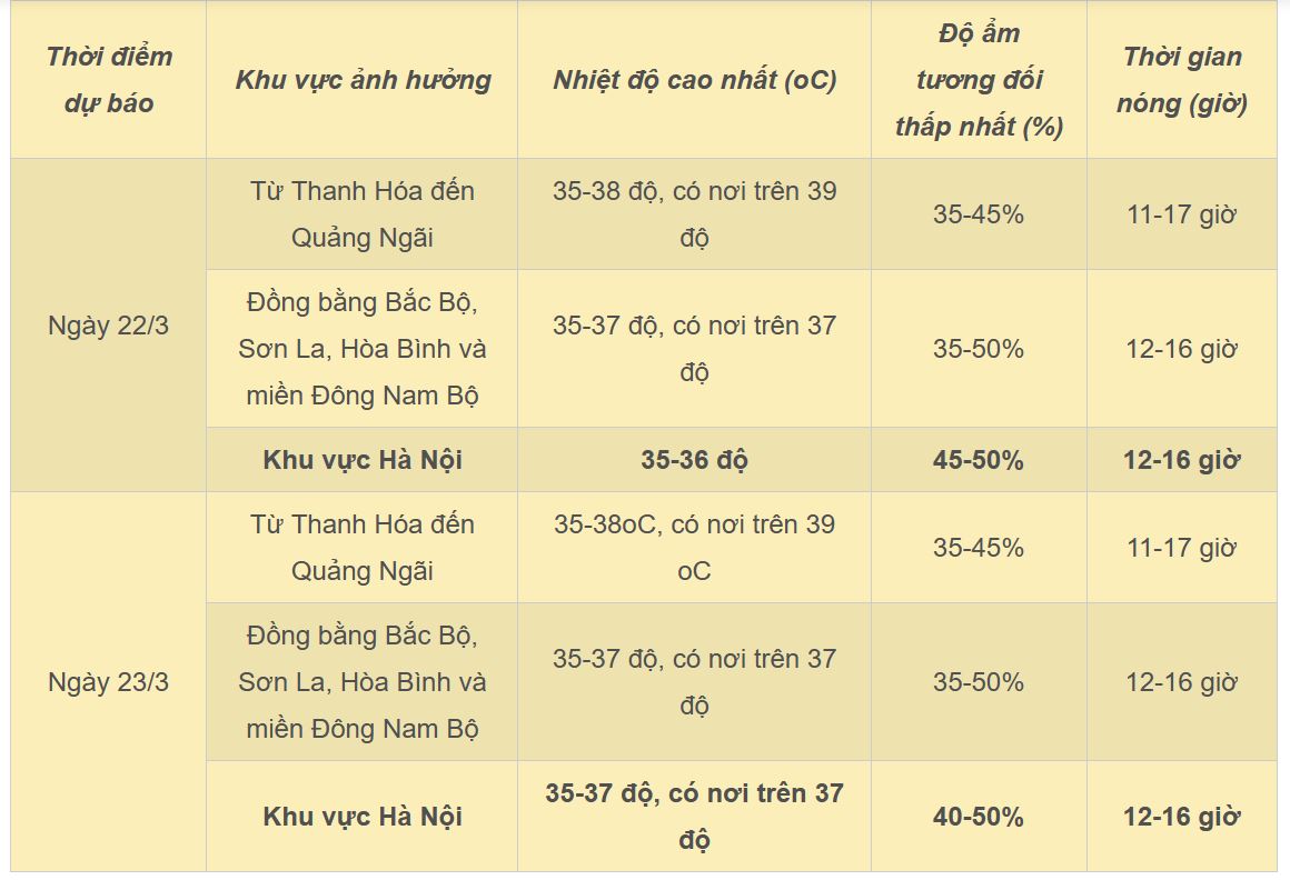 Đặc biệt, từ Thanh Hóa đến Quảng Ngãi sẽ có nắng nóng và nắng nóng gay gắt, có nơi đặc biệt gay gắt, với nhiệt độ cao nhất 35-38 độ, có nơi trên 39 độ, độ ẩm tương đối thấp nhất 35-50%.