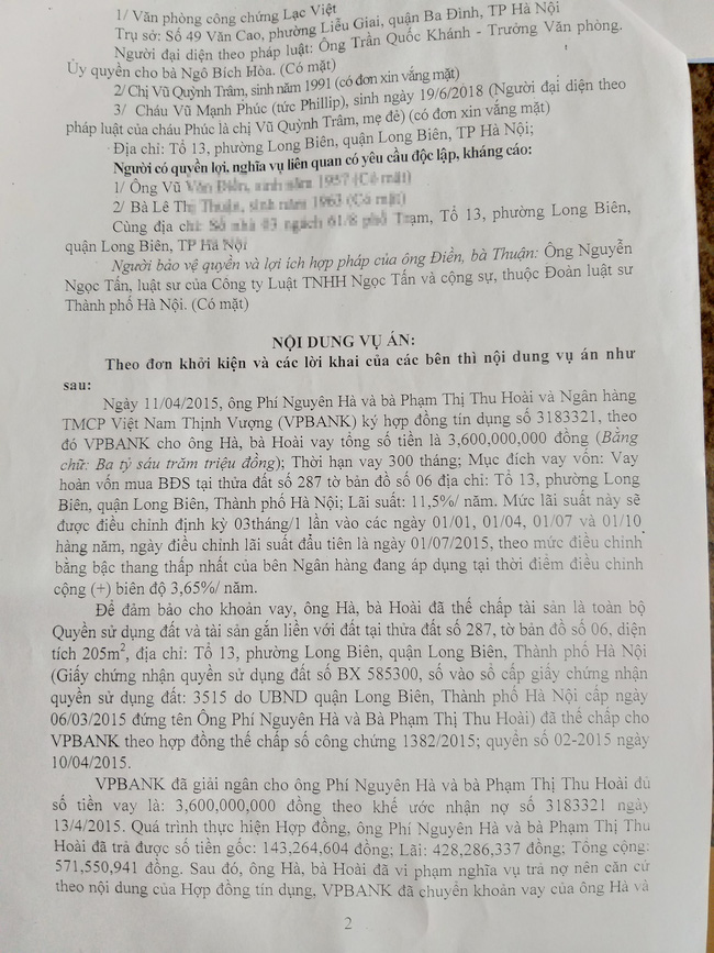 "Đến năm 2017, có cán bộ Ngân hàng VPBANK đến nhà và thông báo cho vợ chồng tôi biết việc anh Hà đứng tên thế chấp để vay 3.600.000.000đ ở ngân hàng của họ. Lúc đó vợ chồng tôi mới biết sự thật. Tôi hỏi lại anh Hà thì anh Hà nói: "Cháu chỉ đứng tên, cô phải hỏi Trang".