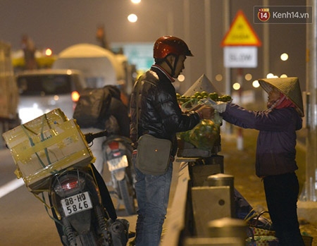 Nhiều người tranh thủ lúc chờ đường thông thoáng dừng mua hoa quả ngay ven đường. |