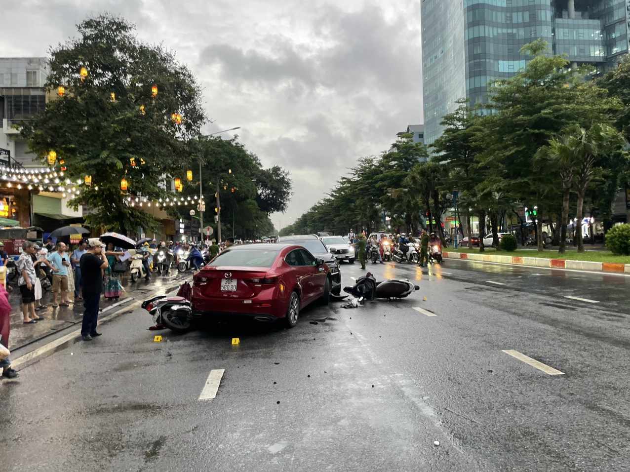 Một số nhân chứng cho biết, vào khoảng thời gian trên, xe ô tô biển số 30H-297.XX do người đàn ông điều khiển lưu thông từ đường Bưởi về phố Phạm Văn Đồng trên đường Hoàng Quốc Việt đã va chạm với xe ô tô biển số 30F-580.XX và 3 xe máy.