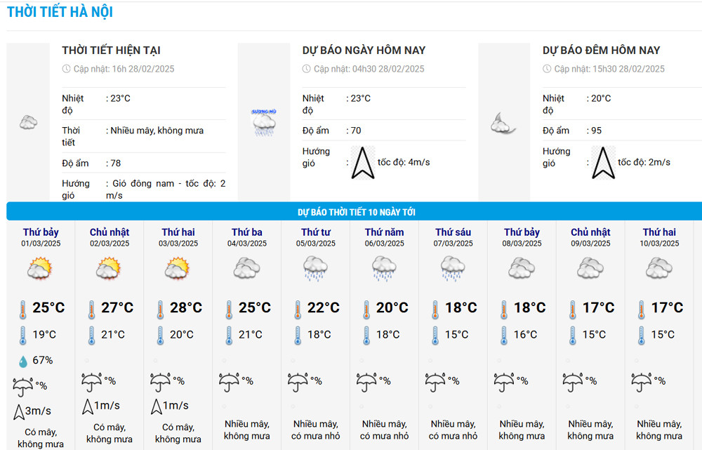 Như vậy, từ nay đến khoảng 3/3, trước khi đợt không khí lạnh mới tràn về, nền nhiệt khu vực trên tiếp tục tăng nhanh vào ban ngày, trong đó thủ đô Hà Nội cao nhất 28 độ vào 3/3; đêm và sáng sớm trời rét với mức thấp nhất 19-21 độ. Ngoài ra, một số tỉnh ở Tây Bắc có nắng và tăng cao nhất đến 33 độ vào 5/3.