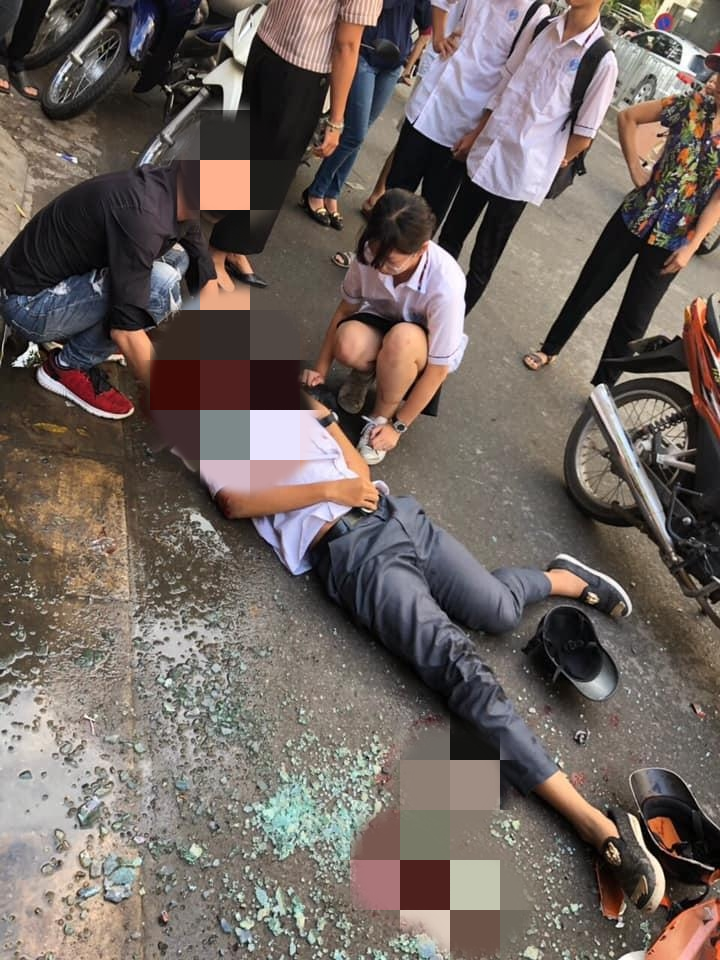 Cú tông mạnh khiến phương tiện ngã văng ra đường, nam sinh bất tỉnh tại chỗ với nhiều vết thương trên mặt.
