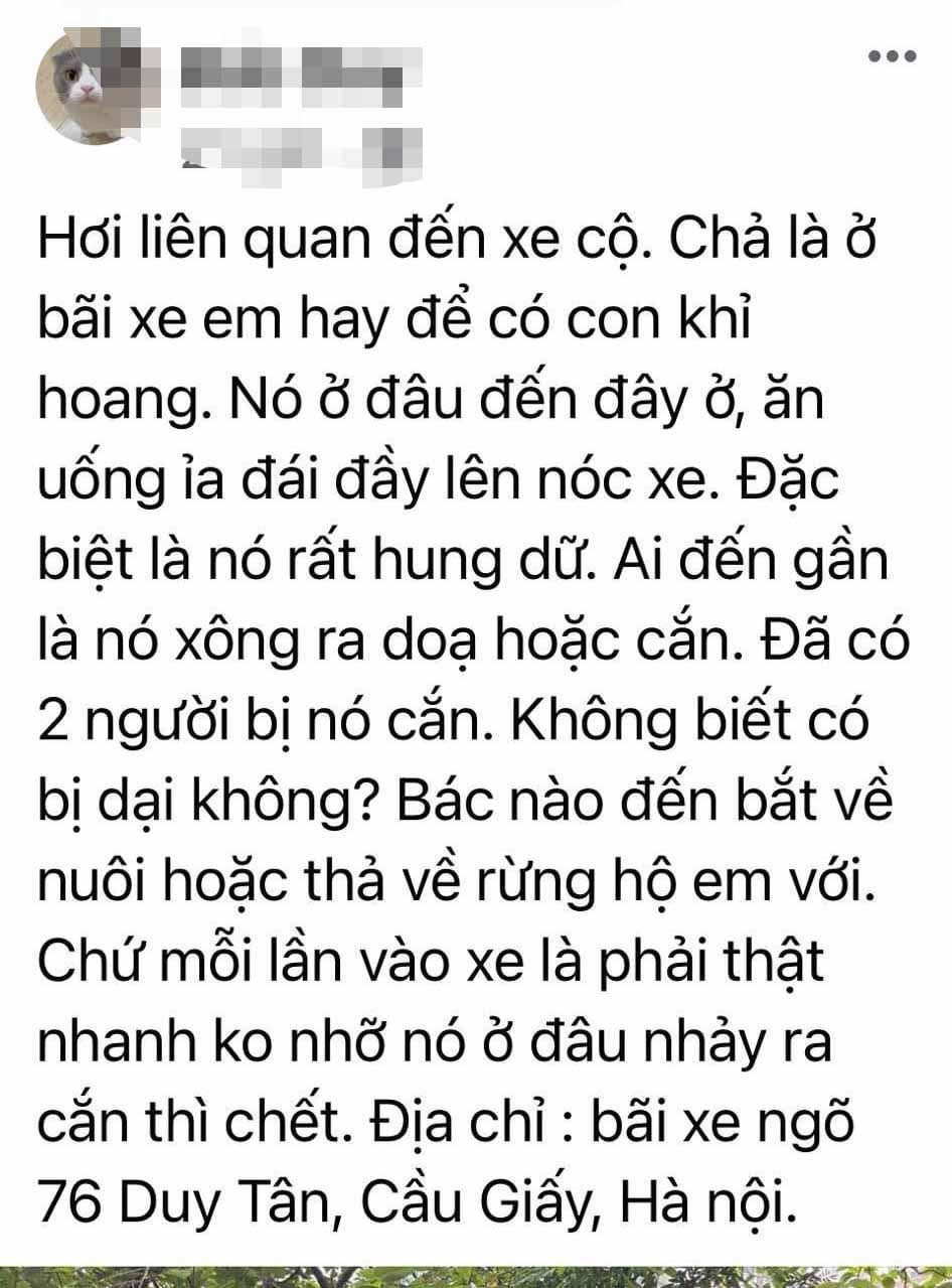Theo nội dung bài viết, con khỉ hoang này thường xuyên xuất hiện ở bãi xe trong ngõ 76, đường Duy Tân. Nó đến quậy phá, tiểu tiện bừa bãi vào xe ô tô, bãi xe.