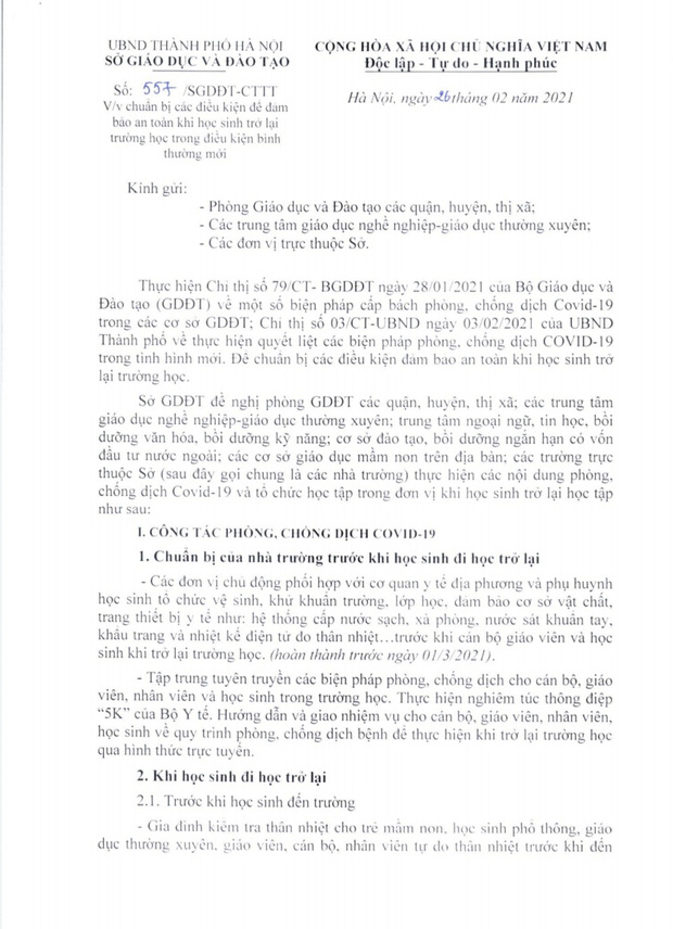 Ngày 26/2, Sở GD&ĐT Hà Nội đã chính thức gửi công văn khẩn về việc chuẩn bị các điều kiện đảm bào an toàn khi học sinh trở lại trường học trong điều kiện bình thường mới.