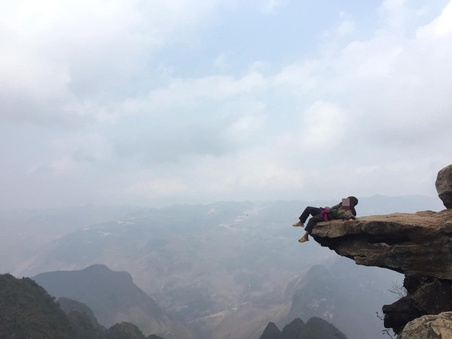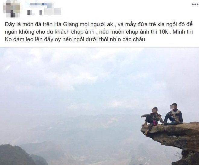 “Đây là mỏm đá trên Hà Giang mọi người à, và mấy đứa trẻ kia ngồi đó để ngăn không cho du khách chụp ảnh, nếu muốn chụp ảnh thì 10k. Mình thì không dám leo lên đấy rồi nên ngồi dưới thôi nhìn các cháu”.