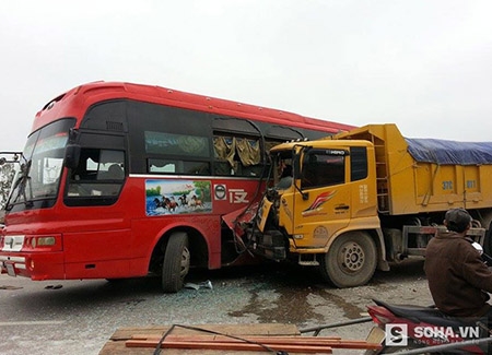 Chiếc xe khách bị vỡ nát phần hông xe gần ghế lái, nhiều kính cửa sổ bị vỡ nát. Riêng xe tải bị nát bét một phần đầu bên phải, toàn bộ kính bị vỡ.