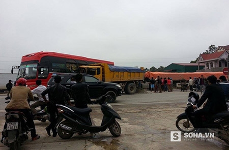 Giao thông qua đây bị ách tắc cục bộ sau vụ va chạm giữa xe ben và xe khách. |