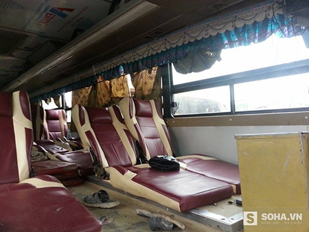 Phía bên trong xe khách, nhiều cửa kính bị vỡ. May mắn, chỉ một số hành khách bị thương nhẹ, trong đó có bé trai 3 tuổi. |