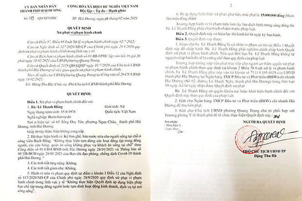 Theo bà Hà, hành vi của chị H. đã vi phạm quy định “không thực hiện quyết định áp dụng biện pháp hạn chế tập trung đông người hoặc tạm đình chỉ hoạt động kinh doanh, dịch vụ tại nơi công cộng” quy định tại Nghị định số 117/2020/NĐ-CP của Chính phủ ngày 28/9/2020.