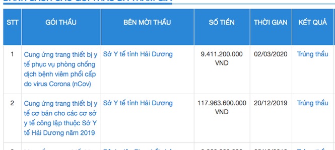 Ngoài gói thầu trên, tháng 12/2019, Cty Gia Vũ thực hiện gói thầu “Cung ứng trang thiết bị y tế cơ bản cho các cơ sở y tế công lập” lên tới gần 118 tỷ đồng cho Sở Y tế Hải Dương.