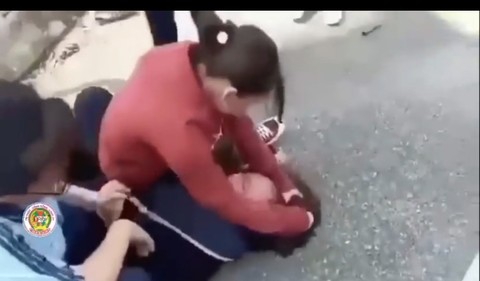 Đoạn clip ghi lại cảnh một học sinh nữ mặc áo thể dục trường THCS Đức Hòa Thượng, huyện Đức Hòa (Long An), bị 7 học sinh nữ cùng mặc đồng phục lao vào đánh liên tiếp vào mặt, đè xuống nền đường.
