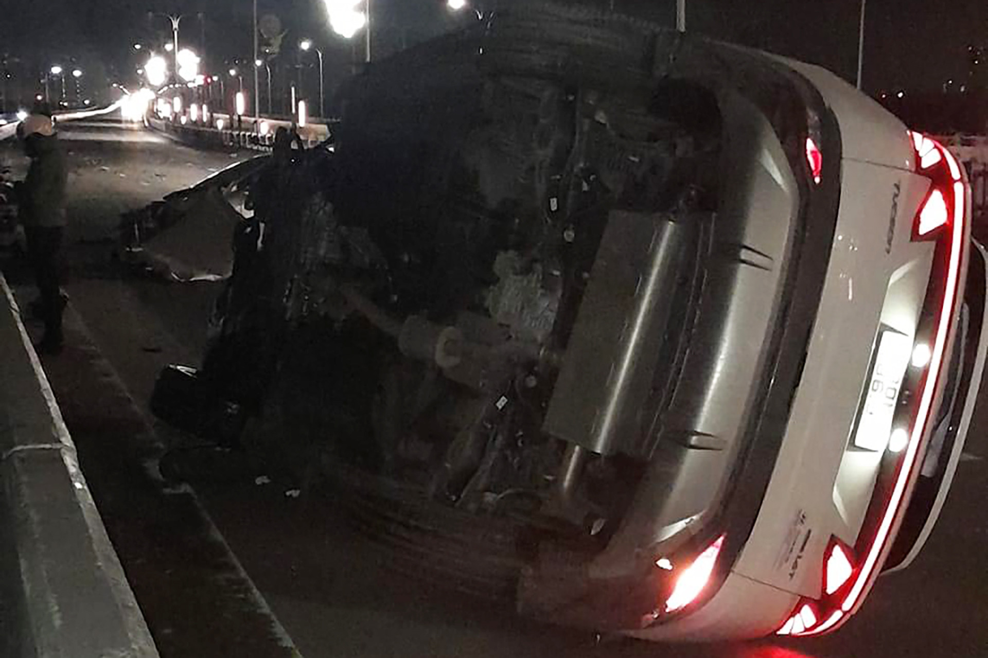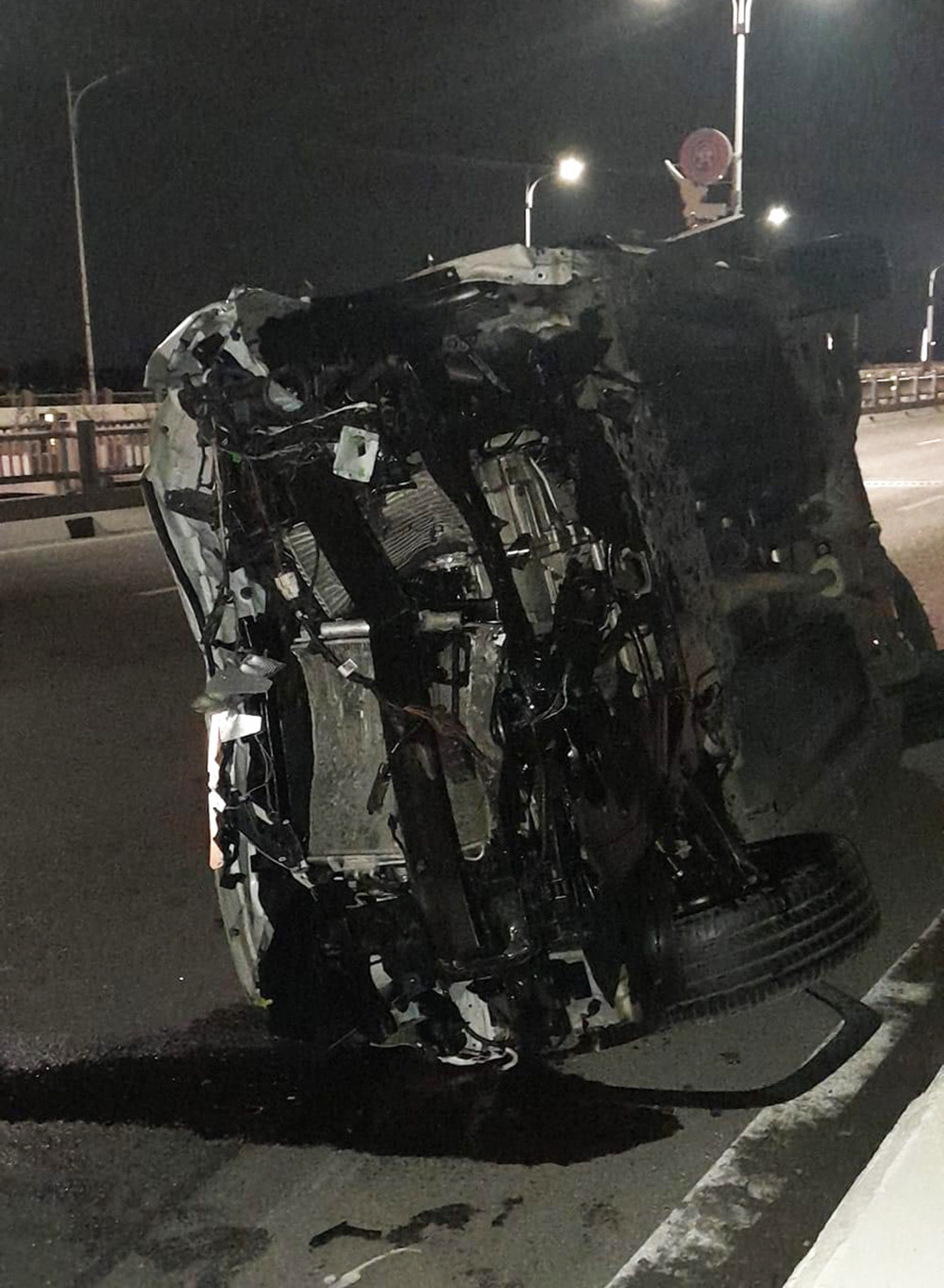 Cú va chạm mạnh khiến ô tô mang BKS 30K- 186.XX bị lật nghiêng, nằm sát dải phân cách giữa làn đường dành cho ô tô và xe máy; ô tô còn lại biến dạng, gãy trục bánh xe phía trước.