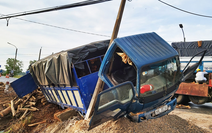 Cú tông mạnh khiến xe tải chở củi bị đẩy về phía trước hơn 10 m, va vào cột điện. Cabin chiếc ôtô tải còn lại bẹp dúm.