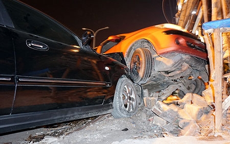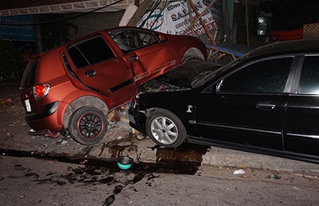 Ôtô màu đỏ nằm chồng trước đầu xe màu đen. Ảnh: Nguyệt Triều |