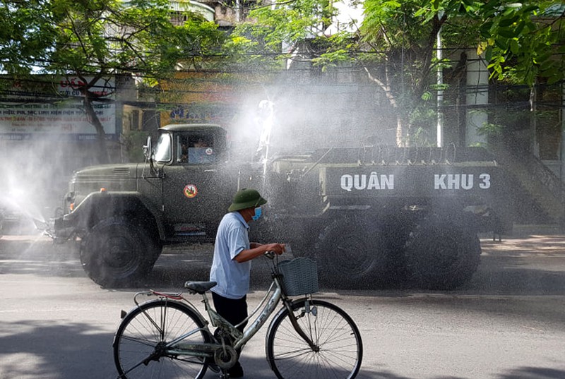 Sáng 11/8, Sở Y tế Hải Phòng phối hợp với Bộ Tư lệnh Quân khu 3 tổ chức phun hóa chất khử trùng các tuyến đường chính của thành phố.