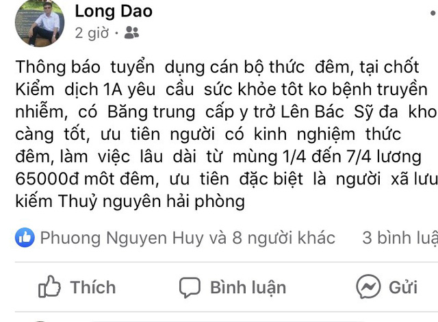 Chưa dừng, nick Long Dao còn đăng hẳn tin tuyển dụng người chốt trực với nội dung: "Tuyển dụng cán bộ thức đêm tại chốt Kiểm dịch 1A yêu cầu sức khỏe tốt, không bệnh truyền nhiễm, có bằng trung cấp y trở lên, bác sĩ đa khoa càng tốt, ưu tiên người có kinh nghiệm thức đêm, làm việc lâu dài từ mồng1 / 4 đến 7 / 4 lương 65.000 đồng/đêm, ưu tiên đặc biệt người xã Lưu Kiếm…"