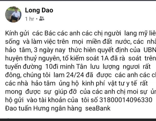 Theo nội dung người dân cung cấp, ngày 28/3 trên facebook cá nhân có nick Long Dao (được cho là trang cá nhân của Bí thư Chi bộ thôn A1, làng Mỹ Liệt tên Đào Long) đăng tải : "Kính gửi các bác, các anh chị người làng Mỹ Liệt sống và làm việc trên mọi miền đất nước, các nhà hảo tâm. 3 ngày nay, thực hiện quyết định của UBND huyện Thủy Nguyên, tổ kiểm soát A1 đã rà soát trên tuyến đường 10 đi Minh Tân, lưu lượng người rất đông, chúng tôi làm 24/24 đã được các anh chị, các nhà hảo tâm ủng hộ kinh phí vật tư y tế, rất mong được sự giúp đỡ của các anh chị, mọi sự ủng hộ vào tài khoản của tôi (?) số 31800014096xxx Đào Tuấn Hưng, ngân hàng SeaBank".