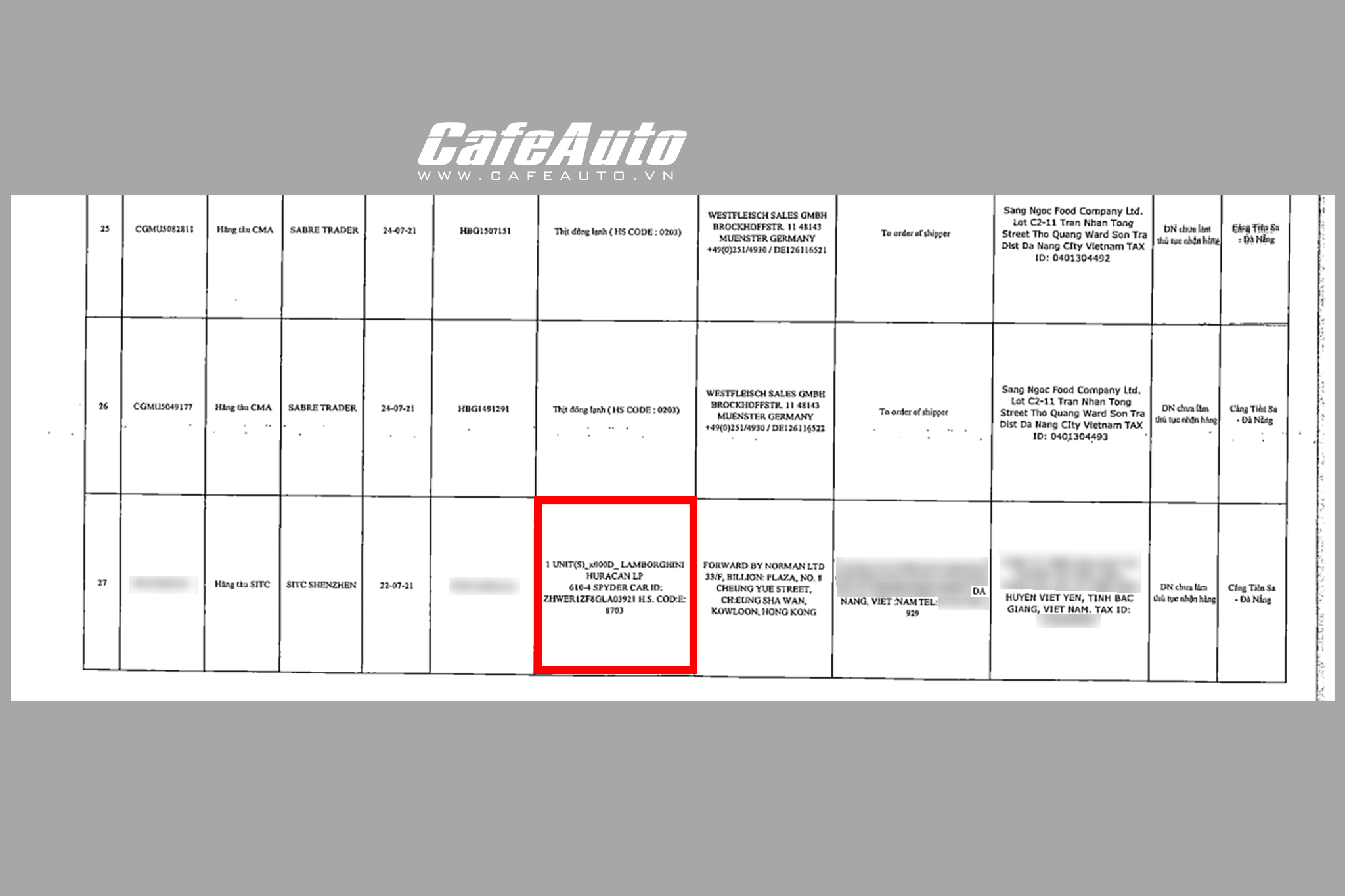 Đặc biệt hơn, phía công ty nhận hàng khai báo hàng hóa là Lamborghini Huracan LP610-4 Spyder. Chiếc xe cập cảng từ ngày 22 tháng 7 năm 2021 trong chuyến hàng vận chuyển từ Hongkong về Đà Nẵng. Thông tin người nhận là một đơn vị hoạt động trong lĩnh vực vận tải có trụ sở tại Đà Nẵng, trong khi thông tin người được thông báo là công ty làm trong lĩnh vực điện tử, máy móc tại Bắc Giang.