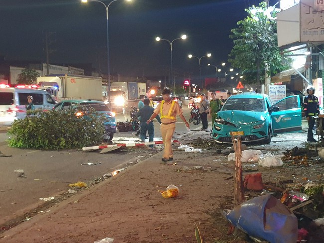 Theo người dân, vào thời điểm trên, xe taxi Xanh SM đã lao lên vỉa hè, tông vào cây xanh và biển báo trước khi đâm vào chiếc xe cùng hãng, rồi đâm tiếp vào 2 xe máy.