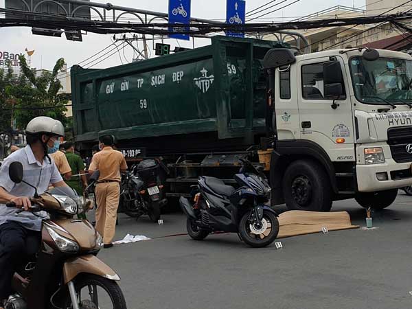 Người dân có mặt tại hiện trường cho biết, xe máy biển số 59S2-272... đã phanh gấp khi va chạm với xe máy kia nên ngã trúng bánh trước của xe chở rác chạy phía sau chỉ khoảng 3m.