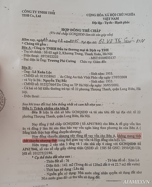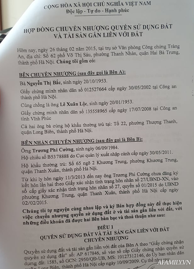 "Cũng trong buổi ký hợp đồng thế chấp này, ông Cường còn bắt tôi ký thêm một hợp đồng chuyển nhượng khác. Tại buổi ký kết có một nhân viên công chứng, nhưng họ cũng không nhắc nhở gì chúng tôi về khả năng sẽ mất nhà khi ký hợp đồng chuyển nhượng nhà cho anh Cường. Thêm vào đó vợ chồng tôi đều cao tuổi, bị say xe và cũng không hiểu rõ các loại giấy tờ nên đã ký vào hợp đồng này. Sau buổi hôm ấy, họ cũng không giao lại cho chúng tôi giấy tờ hay biên lai giao nhận tiền gì", bà Bắc cho biết.