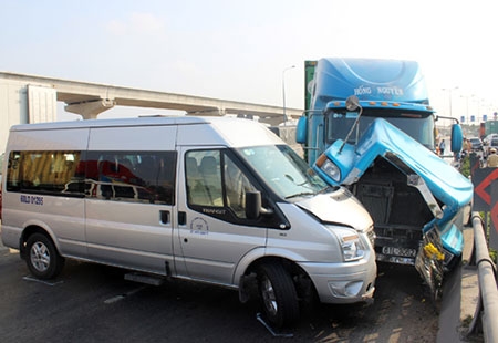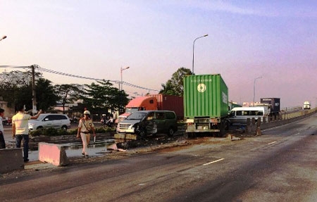 Ba ôtô (loại 7, 9 và 16 chỗ) chở người nước ngoài (chủ yếu là chuyên gia Nhật) bị container húc văng, biến dạng. Xe container dừng lại khi đâm mạnh vào lan can cầu.